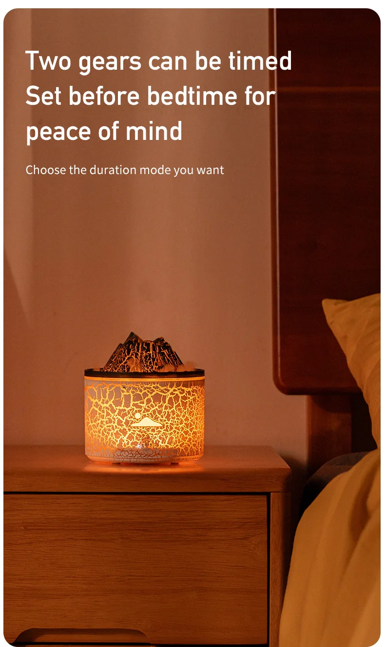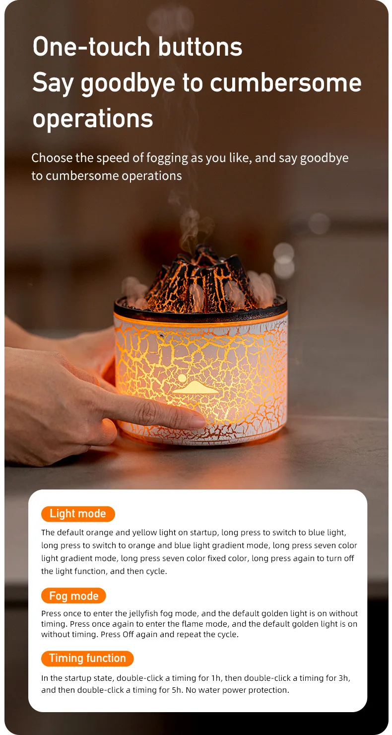 Mist mode: Short press to turn on the device and enter the jellyfish mist mode. At this time, the default golden light is on and there is no timer. Short press again to enter flame mode, and the default golden light will be on without a timer. Short press the shutdown button again to cycle through.